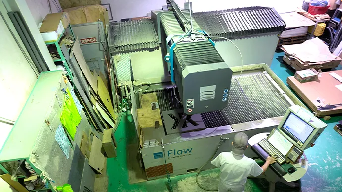 本社正面の独立棟に構えるテクニカルセンターは、ウォータージェット切断を中心とした技術の最前線です。高圧水での精密加工を行うため、機械の動作音はありますが、清潔感があり、整然とした作業空間です。